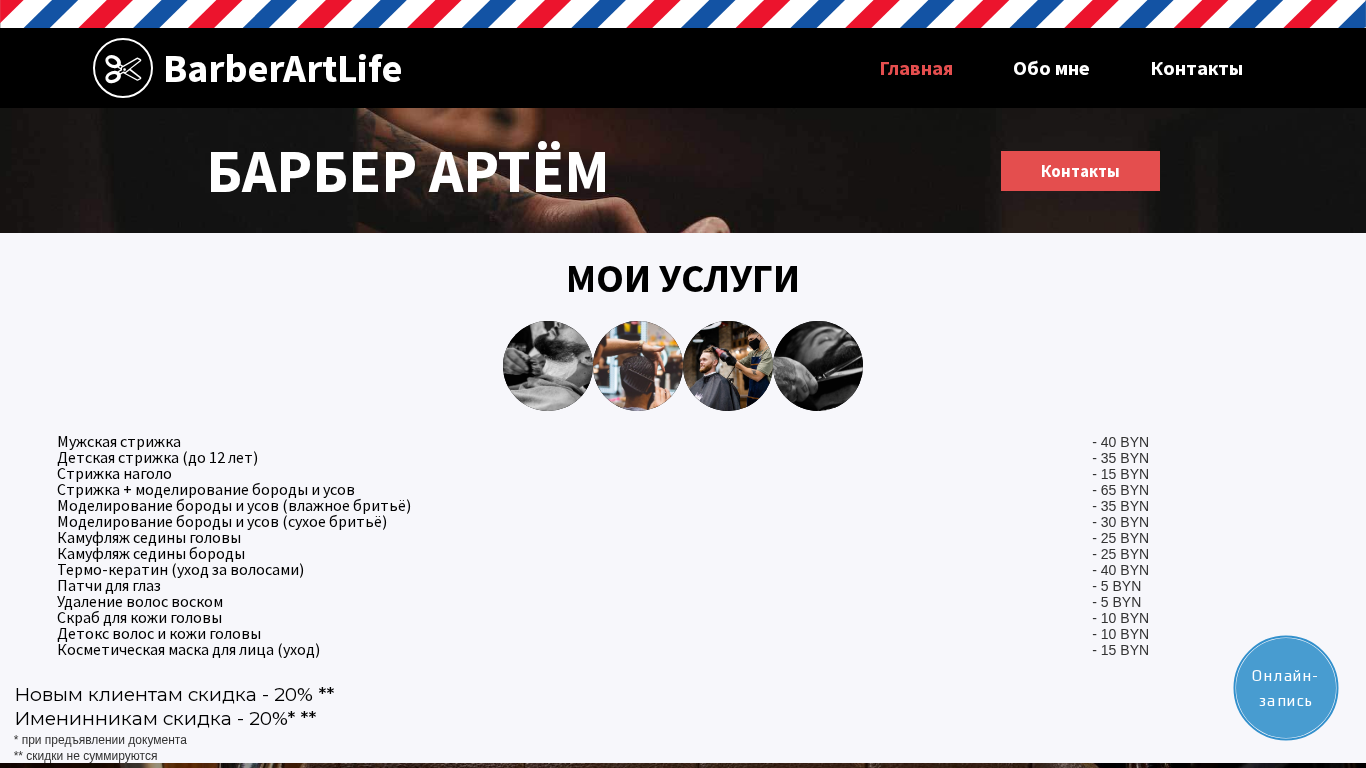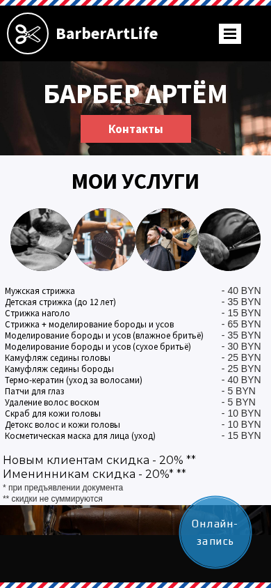 | AI-анализ | The portal BarberArtLife (<https://barberart.by/>) is a website dedicated to men's and children's haircuts, beard and mustache modeling, hair care, and camouflage hair coloring. Key services offered include men's and children's haircuts, beard and mustache shaping, hair care treatments such as thermal keratin and patches for the eyes, wax removal of unwanted hair, and skincare for the head. The site also mentions discounts for new clients and birthday celebrants, with specific discount amounts listed for certain services. Online appointment booking is available. |
