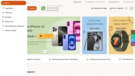| AI-анализ | The portal iPanda.by is an e-commerce store based in Minsk, Belarus, specializing in electronics and smart devices. The website offers a wide selection of products, including smartphones, tablets, laptops, and smartwatches from popular brands such as Apple, Samsung, and Xiaomi. Customers can purchase items online and have them delivered throughout Belarus. The store features discounts, weekly sales, and promotions. The site's menu includes sections for smartphones, tablets, laptops, and accessories. It appears that the iPhone 16 line and the Redmi Note 14, 14 Pro, and 14 Pro+ are currently available for purchase. The Galaxy S25 Ultra can be ordered, and the Galaxy S24 Ultra offers the power of AI. The website also provides a blog about gadgets and a search |