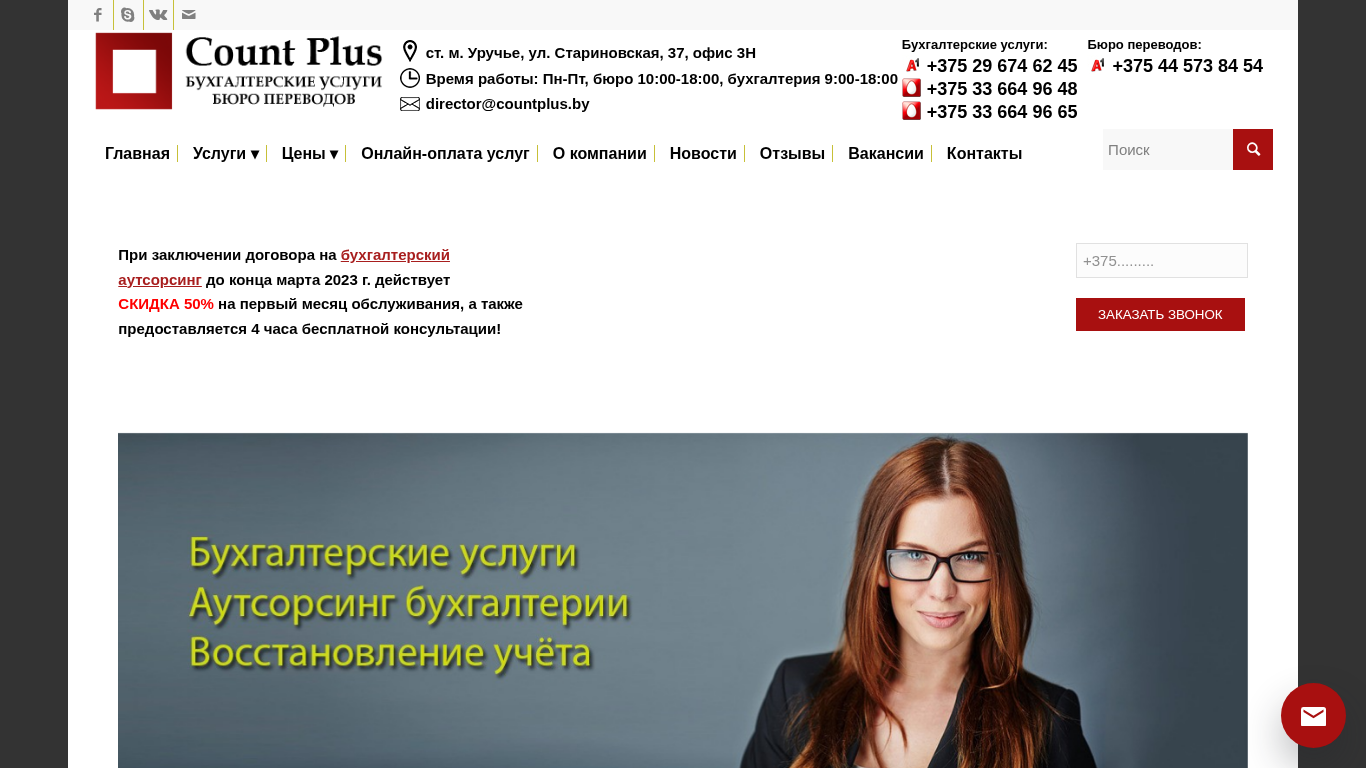| SEO-описание | Оказание бухгалтерских услуг в Минске - компания "Каунт Плас". Услуги бухгалтерского учета для организаций и ИП. Стоимость оказания услуг уточняйте у по телефонам, указанным на сайте. |