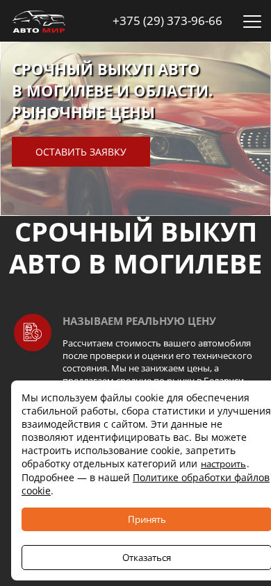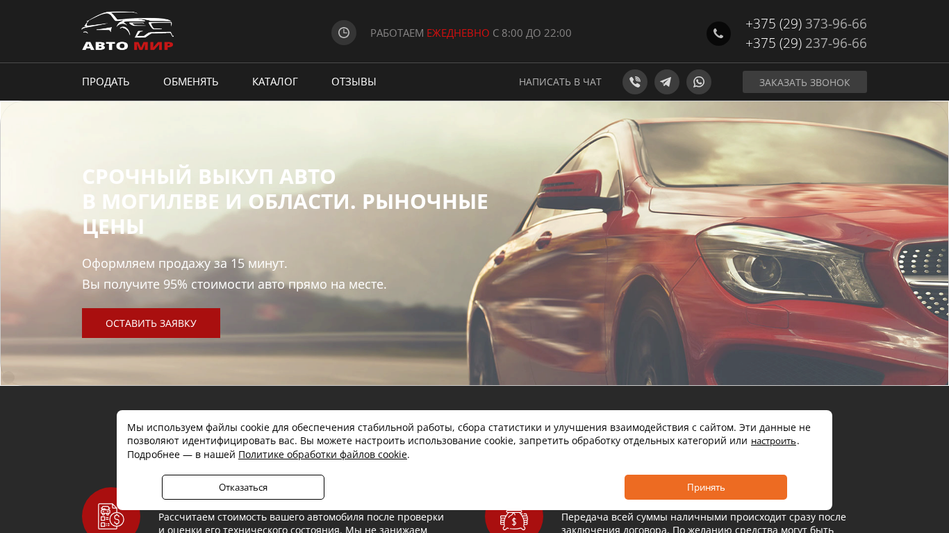 | SEO-описание | Срочный выкуп авто в Могилеве и области по цене от 95% от рынка! Бесплатная диагностика! Все деньги получаете сразу! Скупка автомобилей официально по договору. Продать автомобиль быстро и выгодно. Для выкупа автомобиля звоните! ☎ +375 (29) 373-96-66 |
