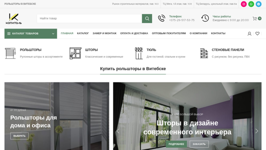 | AI-анализ | --- This online resource is an e-commerce website named Kopital.by, specializing in the sale of rollshades in Vitebsk, Belarus. The website offers a wide selection of rollshades, including classical and modern styles, as well as tull and panel options for both residential and commercial use. Optimum buyers receive a discount. The physical store locations for purchasing rollshades in Vitebsk can be found at Pavilion 160 in the Mega shopping center on the first floor and Pavilion 108 in the Belarus shopping center at the basement level. The phone number for inquiries or orders is +375-29-517-53-75. The website's catalog includes rollshades, shades, tull, and panel options, along with fittings. The company, 'Копиталь |
