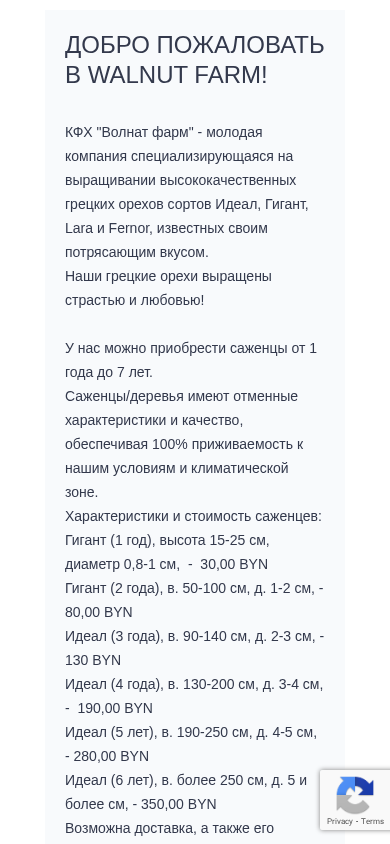| AI-анализ | This online resource is the official website of "Волнат фарм" (Walnut Farm), a young Belarusian agricultural company specializing in the cultivation of high-quality Persian walnuts, specifically the varieties Ideal, Giant, Lara, and Fernor, known for their exceptional taste. The company offers walnut saplings ranging from one to seven years old, all of which exhibit excellent characteristics and quality, ensuring a 100% survival rate in the given climate and conditions. The sapling sizes, heights, and prices are as follows: Giant (1 year) - 30.00 BYN, Giant (2 years) - 80.00 BYN, Ideal (3 years) - 130 BYN, Ideal (4 years) - 190.00 BYN, Ideal (5 |
