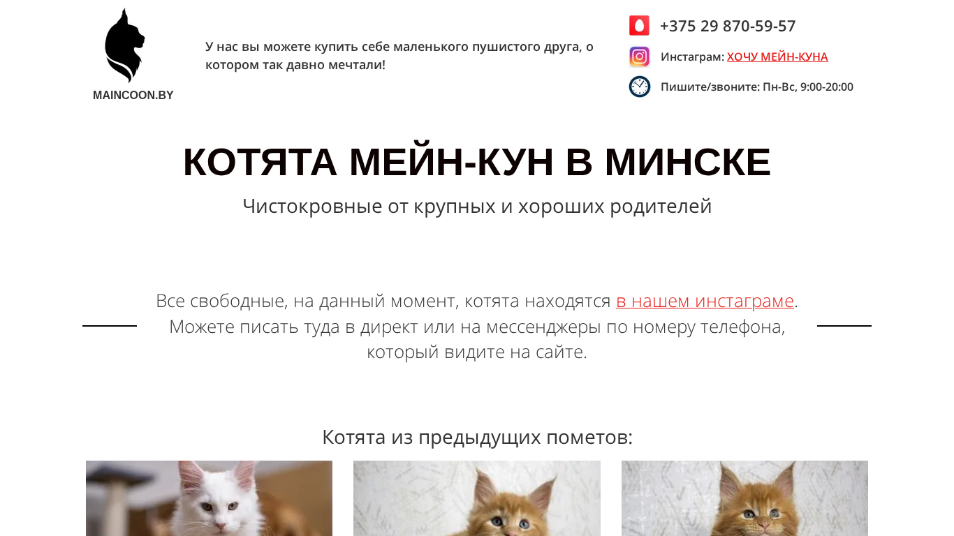 | SEO-описание | У нас вы можете купить породистых котят мейн-кун в Минске по доступным ценам. Чтобы выбрать подходящего котенка, обратитесь по контактным телефонам, которые вы видите на сайте. |