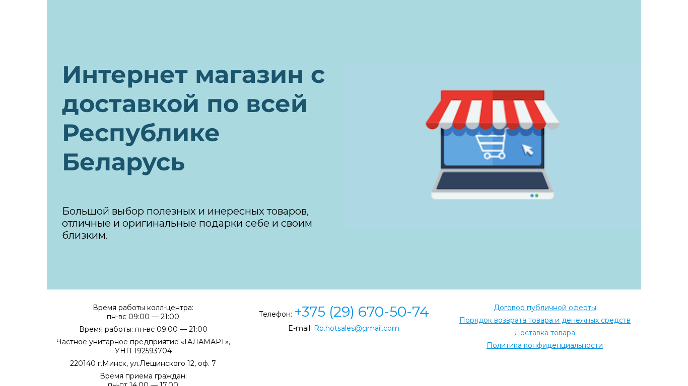 | AI-анализ | This online resource is an e-commerce website named Topsale, which offers various goods for customers' comfort in Belarus. The website guarantees quick delivery across the entire country, convenient payment methods, and excellent customer service. The Internet shop has wide selection of useful and interesting items, as well as original and thoughtful gifts for oneself and loved ones. The customer service center operates from Monday to Sunday, 09:00 to 21:00. The business is registered as a private enterprise, "Galamart," with the Unified State Register of Enterprises number 192593704, located in Minsk, Leonid Leщинского Street 12, Office 7. The office hours for accepting visitors are Monday to Friday, 14:00 to 17:00. The contact details are a phone number, +375 |
