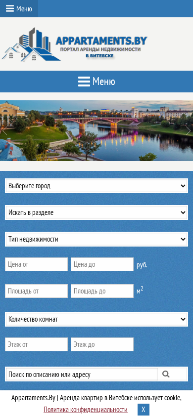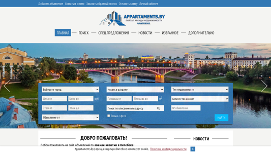 | AI-анализ | --- This website, Appartaments.By, is dedicated to apartment rentals in the city of Vitsebsk, Belarus. Users can quickly find and rent apartments for both short and long-term stays. The website provides verified listings from property owners and reputable agencies. Keywords associated with the website include 'rent apartment in Vitsebsk', 'apartment rentals Vitsebsk', 'apartments for rent in Vitsebsk', and 'rent out apartment in Vitsebsk'. The site uses cookies and offers a privacy policy. Users can add listings, contact the website, request a callback, leave a request, and log into a personal cabinet. The menu includes sections for adding listings, contacting the site, and registering or logging in. Cities to search include Vitsebsk, and users can select the type of property (apartment, house, office), number |