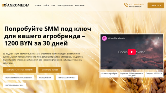 | AI-анализ | The website agromediya.by offers social media marketing services for agricultural businesses. The website provides a form for potential clients to submit their product or business category and inquire about prioritized services, such as increasing brand awareness, boosting sales, strengthening reputation, or entering new markets. The website mentions a 24/7 contact availability and offers a free consultation. The pricing for a 30-day SMM strategy starts from 1,200 BYN, with an option for a test run for 1,000 BYN. The website also lists some examples of their previous clients in the agriculture industry, including a meat processing plant and a bakery. The website is currently considering expanding to Instagram, TikTok, and VK in addition to their existing website presence. The website does not mention having a budget for promotion or if they are currently active on any social media platforms. |