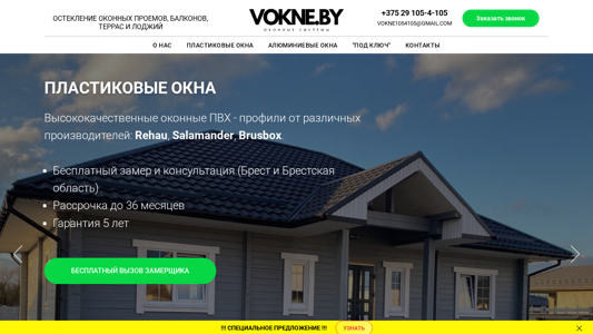 | AI-анализ | --- This website is dedicated to the sale and installation of plastic and aluminum window systems in Brest and the Brest region. It offers an individual approach and financing options. The main sections include plastic windows, aluminum systems, terraces, and verandas. The site emphasizes the importance of glassing for protection against rain, wind, temperature fluctuations, and UV rays. It provides a large selection of decorating options and calculates the cost of plastic windows. The site offers high-quality PVC window profiles from various manufacturers: Rehau, Salamander, and Brusbox. It provides a free measurement and consultation service in Brest and the Brest region. Financing is available for up to 36 months, and the site offers a five-year warranty. The site also features an offer for a free mosquito net or materials for window sills when ordering two windows. Visitors can leave |