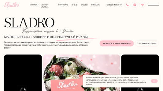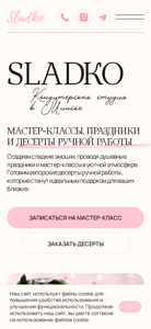 | AI-анализ | This website is a confectionery studio named Sladko, located in Minsk, Belarus. It offers master-classes, parties, and handmade desserts for special occasions and gifts. Visitors can sign up for master-classes, order desserts, and choose from various dessert sets and bouquets. The website uses cookies for user convenience and site improvement. The studio has over 1000 satisfied customers and prides itself on fresh, daily-made desserts and a cozy atmosphere for small groups. The site also features unique dessert collections for various occasions, such as birthdays. Keywords: master-classes, parties, handmade desserts, Sladko. Top words: BYN, chocolate, desserts, more info, basket, September, master-classes, strawberries, clubberries, BELARUS, chocovik, strawberries, strawberry, lett, |