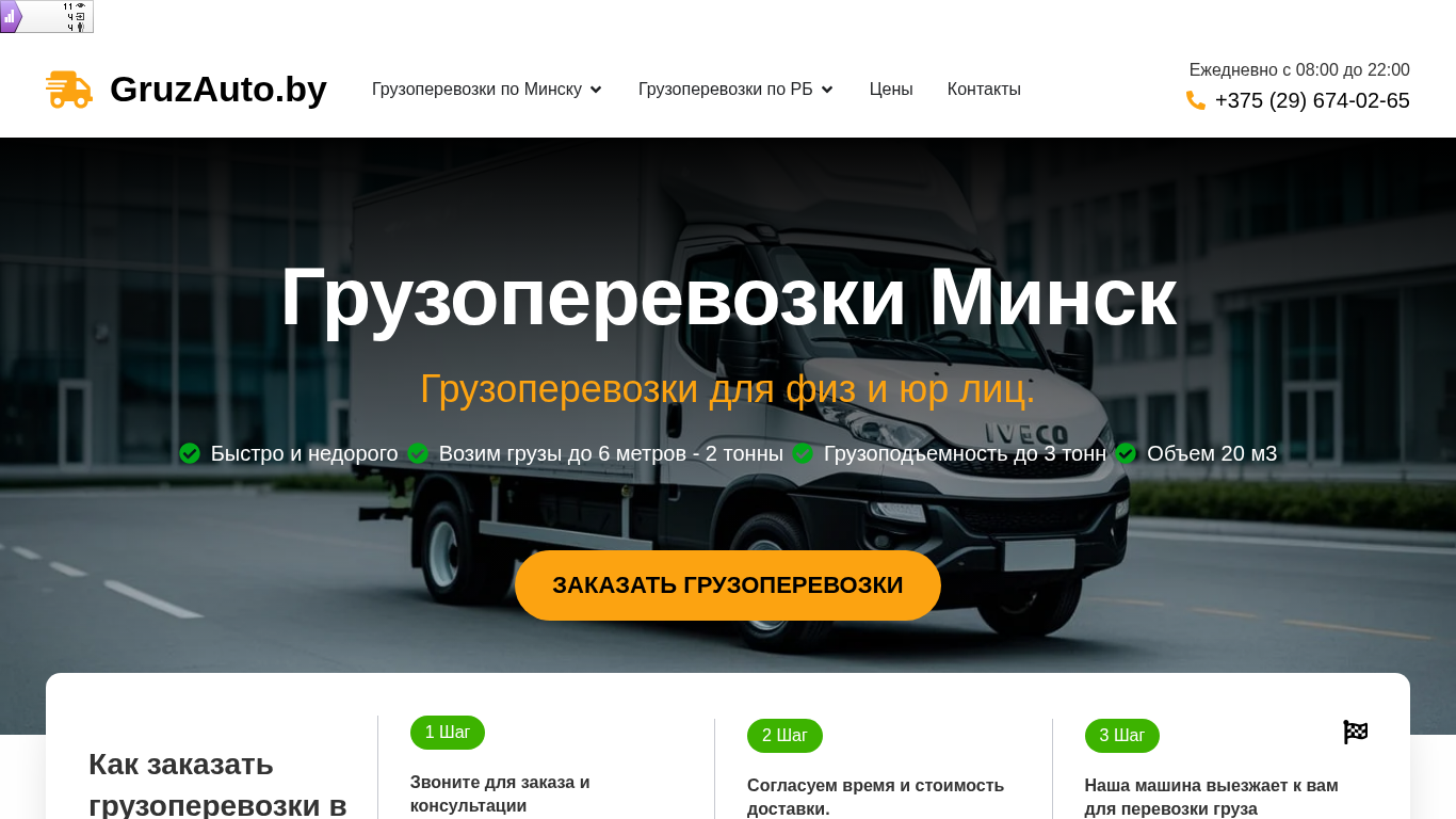 | SEO-описание | Грузоперевозки Минск и другие услуги с 8:00-22:00 до 3 тонн 20м3 . Перевозки с грузчиками от 1 кг до 1,2,3. Цены, отзывы, контакты. Недорого. |
