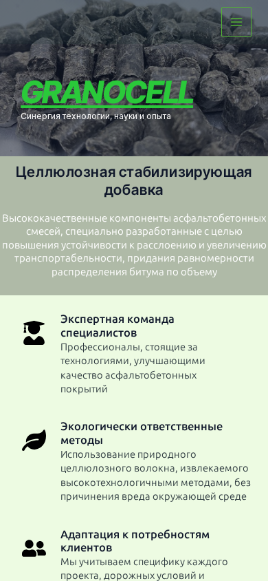 | AI-анализ | This online resource is dedicated to Granocell, a cellulose-based stabilizing additive for asphalt concrete mixtures. The company focuses on the production and sale of high-quality components for asphalt concrete mixtures, designed to enhance durability against rutting and increase transportability, as well as provide uniform bitumen distribution within the volume. The website emphasizes the team of experts behind the technology, eco-friendly methods, and adaptation to client needs. The additives are engineered to meet real-world conditions and requirements of the road construction industry, with a scientific approach that combines research, practical applicability, technological precision, and a focus on high-quality results. The site also highlights the company's extensive experience in engineering solutions for road construction and its commitment to innovation and accessibility for every contractor. The resource offers comprehensive solutions for asphalt concrete construction, with cellulose stabil |