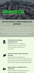 | SEO-описание | Целлюлозная стабилизирующая добавка Granocell для асфальтобетонных смесей, производство и продажа. Повышаем качество дорожных покрытий. |
