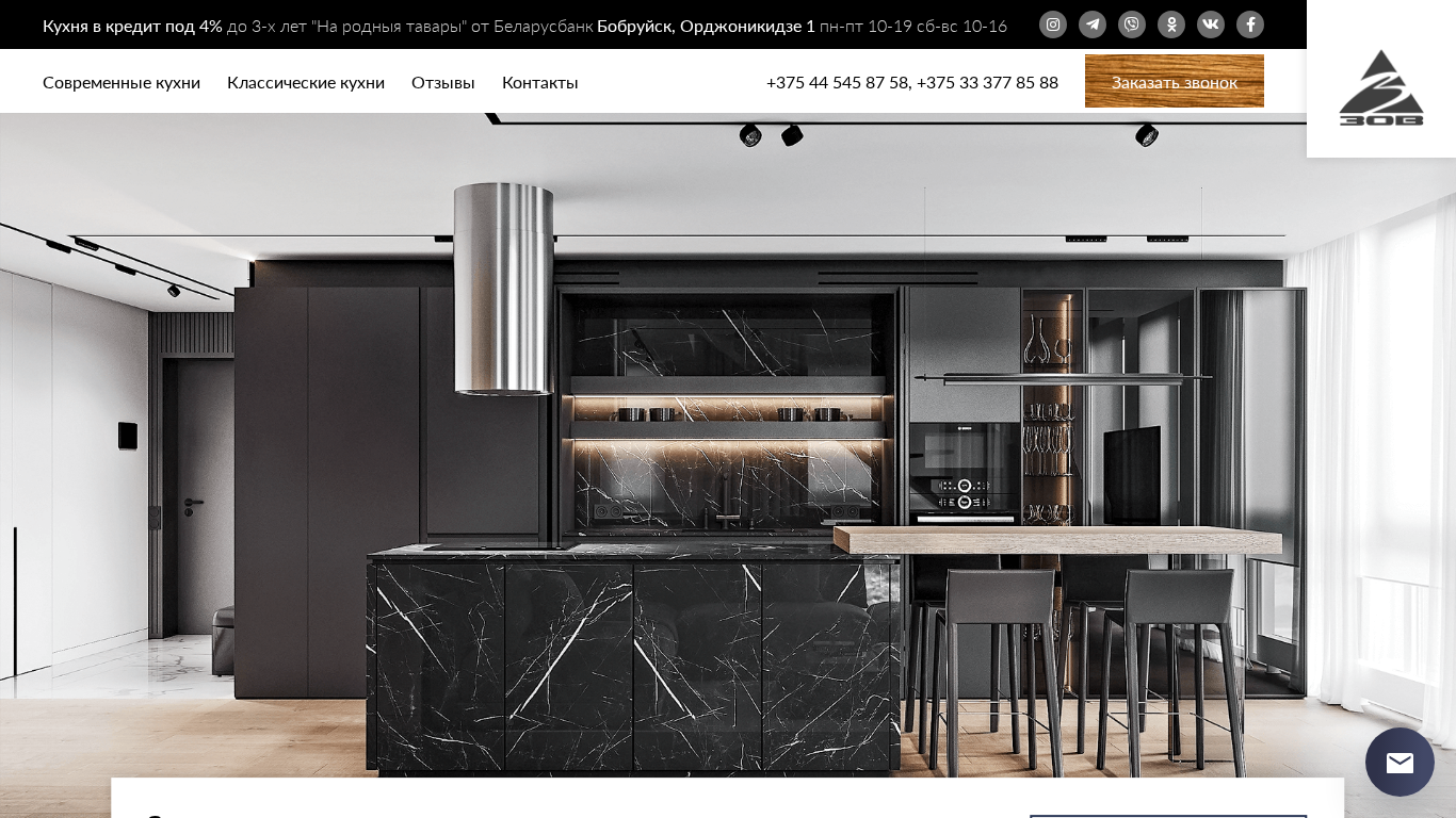 | AI-анализ | This website is for a custom kitchen order service called ЗОВ (Zov) based in Bobruisk, Belarus. The title and description of the website include phrases like "Кухни на заказ" (Kitchens for order) and "ЗОВ | Кухни на заказ" (Zov | Kitchens for order). The keywords also reflect this, with words like "заказать" (to order) and "кухня" (kitchen) being among the top. The website offers both contemporary and classical kitchens, with options for custom sizing and installation. The company boasts a five-year warranty and after-sales service. The website provides contacts for the company, including phone numbers and an option to request a call-back. It also mentions a credit program called "На родныя тавары" (On your own things) from Belar |