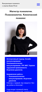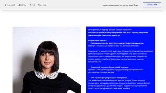 | AI-анализ | This online resource is dedicated to the work of psychologist Julia Shvayko. The website provides information about the psychologist's qualifications, experience, and therapeutic approaches. Julia Shvayko holds a Master's degree in psychology and specializes in psychotherapy, psychodiagnostics, and individual counseling. With over 10 years of experience, she offers consultation services in various areas, including psychoanalytic therapy, trauma therapy, and relationship issues. The website mentions her expertise in treating attachment disorders and the use of therapeutic methods such as TFP and MBT. Visitors can learn about her approach to working with clients, which emphasizes the importance of understanding and addressing unconscious conflicts and emotions. The website also features a book for sale, likely related to the topic of her work. |