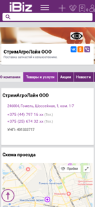 | AI-анализ | The web project 'Agro3.by' is an e-commerce platform for the sale of agricultural machinery parts based in Goмель, Belarus. The company, named StreamAgroLine OOO, provides components for agricultural technology, with contact information including phone numbers +375 (44) 797 16 xx and +375 (25) 674 32 xx. The business hours are Monday to Friday, 9:00 AM to 6:00 PM, with no lunch breaks. The company's UNP number is 491333717. The website includes a map for directions and links to social media platforms such as VKontakte, Odnoklassniki, and Viber. Users can create their own maps and view traffic information on the site. The company is listed under the categories ' |