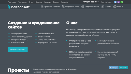 | AI-анализ | This website is a web studio and digital agency called Белтехсофт, specializing in the creation and promotion of selling websites. With 17 years of experience in web development and internet marketing, they offer design, technical support, and contextual advertising services. The portfolio includes various technologies, such as 1С-Битрикс, WordPress, Laravel, and others, for creating and supporting corporate websites, internet shops, and single-page promotional sites. The company also provides technical support for various CMS and custom websites. |