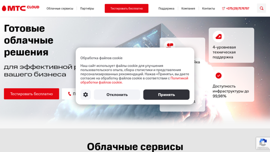 | AI-анализ | The web project "Cloud MTS" offers a range of cloud services and solutions for businesses. Keywords associated with the site include 'cloud', 'security', 'resources', 'data protection', and 'Huawei'. Services provided include Kaspersky and Positive Technologies security systems, audit information security, cryptographic protection, multi-level web application protection, disaster recovery, virtual private server, public cloud for businesses, public cloud based on Huawei, 1C in the cloud, IT outsourcing, corporate email in the cloud, cloud platform for development, cloud SD-WAN, data storage, and backup as a service. Partners, support, FAQ, documentation, pricing, certificates, and articles are also available. The company offers a free trial, consultation, free transfer and setup, and a free test period. Technical support is available at the 4-level. Infrastructure availability is up to |