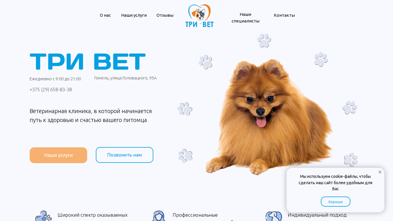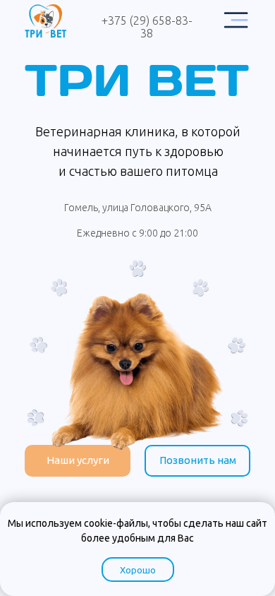 | AI-анализ | --- This online resource is a veterinary clinic website named ТРИ ВЕТ (Trivet). The domain focuses on providing veterinary services in GoMEL, Belarus. Keywords related to the clinic, veterinary care, and GoMEL are prominent in the metadata. The website offers a wide range of veterinary services from consultations and tooth trimming to complex diagnostics and surgeries. The team consists of professional specialists with experience and a personalized approach to every patient. The clinic is open daily from 9:00 to 21:00 and can be contacted via phone at +375 (29) 658-83-38 or in person at GoMEL, Ulitsa Golevatskogo, 95A. The site includes sections for services, contacts, and testimonials. |