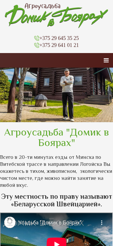 | AI-анализ | The web project "Агроусадьба 'Домик в Боярах'" is a rural resort located 25 km from Minsk in the Lогойское direction. It offers a range of services for quiet family leisure or small groups (up to 7 people), combining nature and comfort. The property includes a children's playground, billiards, a resting cabin, sauna with firewood, Russian oven, excursions, and a health trail. Pricing, contact information, and reservations can be found on the website. The site also features a photo gallery showcasing various seasons and aspects of the estate. The estate is known as the 'Belarusian Switzerland' for its peaceful and picturesque surroundings. |
