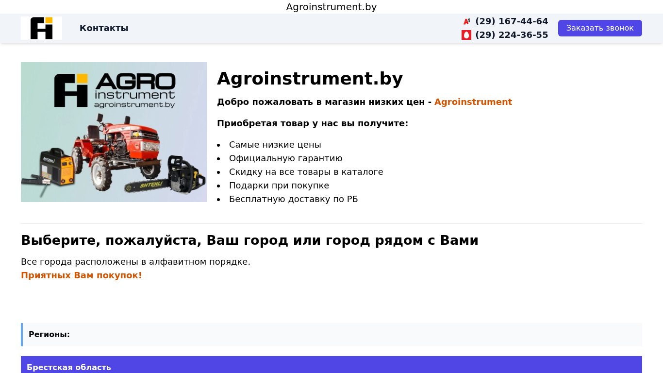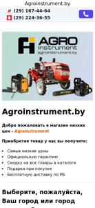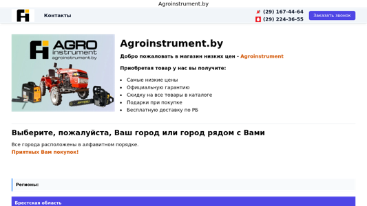 | AI-анализ | This online resource, Agroinstrument.by, is an e-commerce website offering agricultural instruments at the lowest prices. Customers can purchase items with official guarantees and enjoy discounts on all products in the catalog. The site also offers free shipping within Belarus. Users can select their city from a list, arranged alphabetically, for more specific information. The company's contact details include two phone numbers: (29) 167-44-64 and (29) 224-36-55. The website operates from 09:00 to 23:00 and provides an email address, agroinstrument.shop@gmail.com, for customer inquiries. The Unified State Register of Enterprises identifies the company with the UNP number 193543133. The website includes a tag for ' |