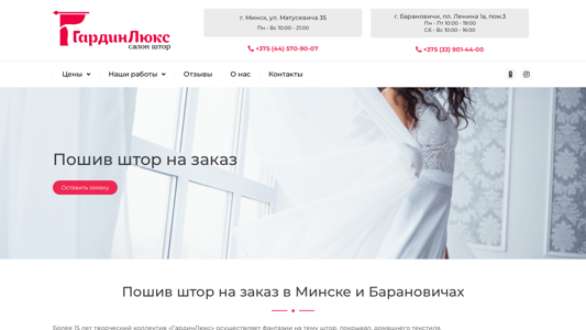 | AI-анализ | This online resource is a curtains and drapery store named 'ГардинЛюкс' (GardinLux). The title of the website is 'Пошив штор - Салон штор «ГардинЛюкс»' (Curtain Making - GardinLux Store). The business operates in both Minsk and Baranovichy, Belarus. The main services offered include custom curtain making, and the store sells various types of curtains for different rooms, including living rooms, children's rooms, kitchens, bedrooms, and public spaces. They also sell drapery accessories and paddings. The store utilizes high-quality equipment for production and guarantees a high level of craftsmanship. Pricing information includes costs for stitching, hemming, adding decorative thread or braid, and adding lace or other embell |