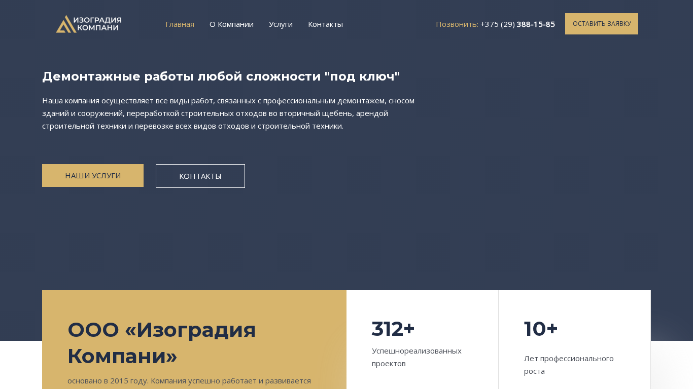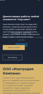 | AI-анализ | This website is for a company named Изоградия Компани, specializing in various demolition and construction services. The company offers services such as the execution of all types of demolition works, including the dismantling of buildings and structures, the demolition of chimneys, and the removal and processing of construction waste into secondary gravel. They also provide equipment rental and transportation services for construction waste and machinery. The company, founded in 2015, has a team of professional and certified engineers and technicians, and a modern material and technical base, ensuring high-quality production and significant reduction in production time. The website includes sections for services, contacts, and a main menu with links to the home page, company information, services, and contacts. The company provides official documentation for all necessary paperwork, operates efficiently and without interruptions, and offers a comprehensive approach to solving all issues related to the removal and |