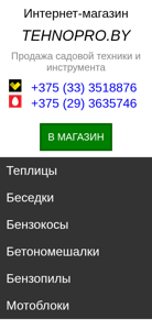 | AI-анализ | This online resource is an e-commerce website named TEHNOPRO.BY, specializing in the sale of gardening equipment and tools with discounts. The website's title is "Садовая техника со скидкой" (Gardening equipment with discounts), and the description contains relevant keywords such as "садовая техника" (gardening equipment), "техника" (technology), "скидкой" (discount), "интернет-магазин" (online shop), and "техпро" (TEHNOPRO). The top_words data reveals that the website offers for sale various types of gardening equipment including teplitsy (greenhouses), besedki (arbor), benzokosy (gas trimmers), betonomešal'ki (concrete mixers), benzopil'y |