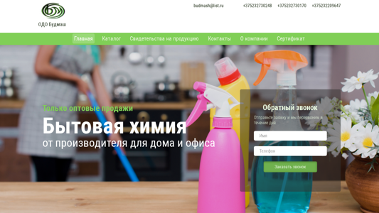 | AI-анализ | This website is an e-commerce platform for buying household chemicals from the manufacturer Budmash. The title of the website is "Бытовая химия от производителя для дома и офиса" (Domestic Chemistry from the Manufacturer for Home and Office). The description includes keywords related to cleaning products, such as "чистящее средство" (cleaning agent), "санитарно-гигиеническое" (sanitary-hygienic), and "подробнее" (detailed information). The top words indicate that the website offers products for both home and office use, and includes a catalog, customer service contacts, information about the company, and certifications. The website sells only to businesses, as indicated by the "только оптовые продажи" (only wholesale sales) statement. The products listed include various cleaning pastes and liquids, as |