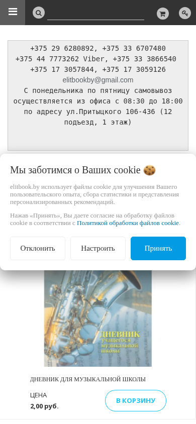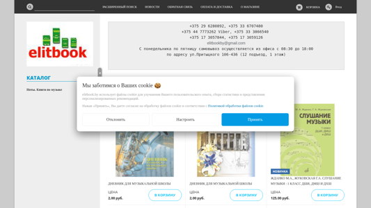 | AI-анализ | This website is an online bookstore named Elitbook. It offers a wide range of music-related products including sheet music for various instruments, music books, and solfege exercises. Users can search for items using an extended search function or browse popular categories such as dnevnik (music school notebooks) and solfeggio exercises. The store also provides a registration feature for personalized account management and offers delivery and payment information. Additionally, it features contact details for inquiries and customer support. The website is written in Russian and offers phone numbers and emails for contact. The store's physical location is in Belarus, specifically at ul.Prytytskogo 106-436 (12 pod'yezd, 1 etazh). Popular items include a music school notebook for 2 rubles and a solfege exercise workbook for 6 rubles  |