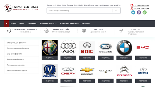 | AI-анализ | This website is an e-commerce platform selling and installing farkops (rooftop carriers) in Minsk, Belarus. Customers can purchase farkops and arrange installation services for their vehicles on the site. The site offers farkops at low prices across Belarus. The contact number for inquiries is +375 33 604-55-66. The site's top keywords include 'farkop', 'buy', 'install', 'Minsk', 'Belarus', and 'cheap'. The catalog features a wide range of farkop brands such as Alfa Romeo, Audi, BAIC, Belgee, BMW, BYD, Changan, Chery, Chevrolet, Chrysler, Citroen, Daewoo, Datsun, Dodge, Dong |