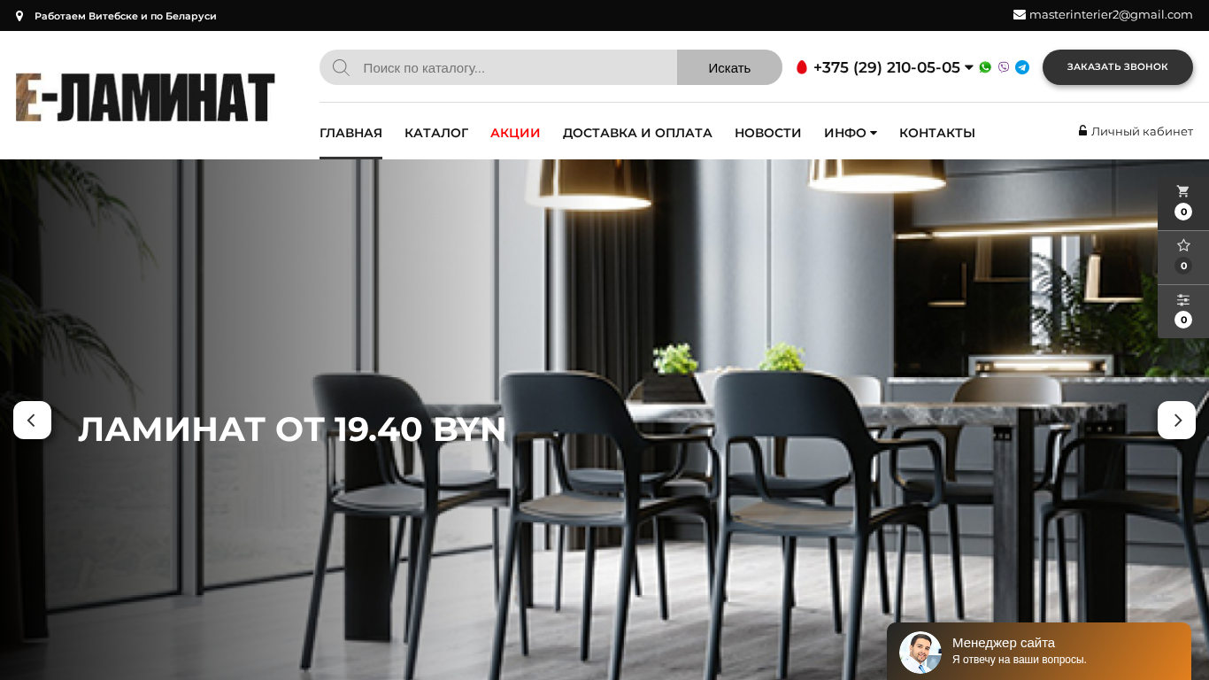| SEO-описание | Компания e-laminat реализует большой ассортимент ламината, линолиума, кварцвинила и комплектующих высокого качества. Официальный представитель поставщиков напольных покрытий в Витебске. |