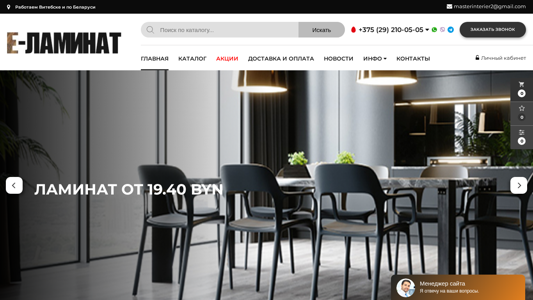 | AI-анализ | --- This online resource is a website for a company named e-laminat that specializes in the sale of various floor coverings such as laminate, linoleum, quartz vinyl, and related components. The company acts as an official representative for flooring suppliers in Vitsebsk, Belarus. The website provides options for quick orders, with fields for entering personal information, contact number, and email address. The site also offers a catalog of products, information on delivery and payment, news, customer reviews, and details on various brands such as Kastamonu, Kronostar, Tarkett, Krono Original, Juteks IVC, Ideal, Komfort Standard, Danke, CronaFloor, and SPC. The site also offers a cart feature and a personal cabinet for managing orders. The website is available in both Russian and Belarusian languages. |