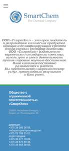 AI-анализ | The web project "OOO Smart Him" is a Belarusian company specializing in the production and development of chemical products, cleaning and disinfecting agents for various industries. The company adheres to European quality standards and employs the latest scientific achievements. OOO Smart Him offers a wide range of services, delivering superior results and ensuring customer success. The website provides information on their offerings for the food industry, meat and dairy processing, and dairy farming, including penning and dezinfecting agents, hygiene products for cows and cow care products, and veterinary preparations. Contact information for the company is provided, including phone numbers and email addresses. |