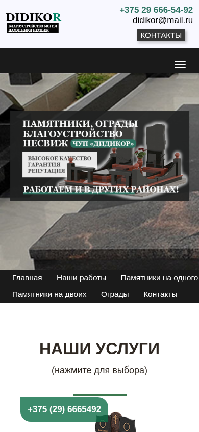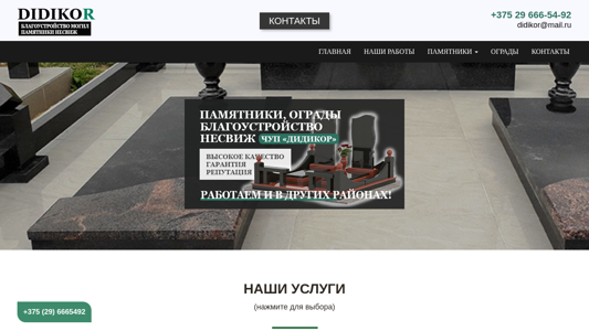 | SEO-описание | ЧУП ДИДИКОР более 20 лет производит памятники, ограды в городе Несвиж. Благоустройство, установка оград и памятников. |