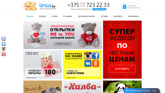 | AI-анализ | --- The website is an e-commerce platform specializing in selling plush toys, specifically teddy bears and other soft toys, with delivery available in Minsk and all of Belarus. The website offers a large selection of soft toys, including various sizes of teddy bears, pandas, and Scandinavian gnomes. Prices range from 60 rubles to 200 rubles, and the toys come in various colors and sizes, from 100 cm to 230 cm in height. The website also features a catalog for optics, as well as information on delivery and payment options, and customer reviews. The domain name is ursus.by. |