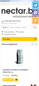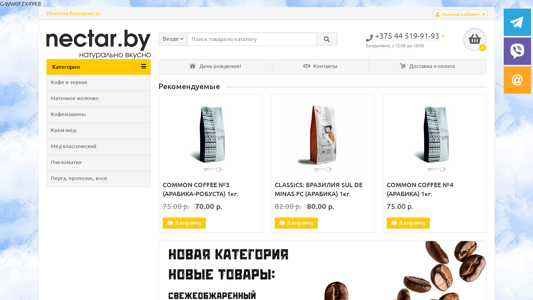 | AI-анализ | The web project Nectar.by is an e-commerce platform based in Minsk, Belarus, specializing in the sale of honey, propolis, beeswax, coffee beans, and coffee machines. The site offers various types of natural honey, including local and imported ones, as well as coffee beans and coffee machines for purchase. The keywords reflect the main product categories and the location of the business. The site features a personal cabinet for registration and authorization, as well as a policy of security. The contact information includes a phone number and an email address for inquiries and orders. The site offers delivery and payment options, and the products are categorized into coffee beans, milk, coffee machines, honey, and beeswax. Recommended items include Common Coffee No. 3, Classics: Brazil Sul de Minas FC, and various types of honey and beeswax. The business |