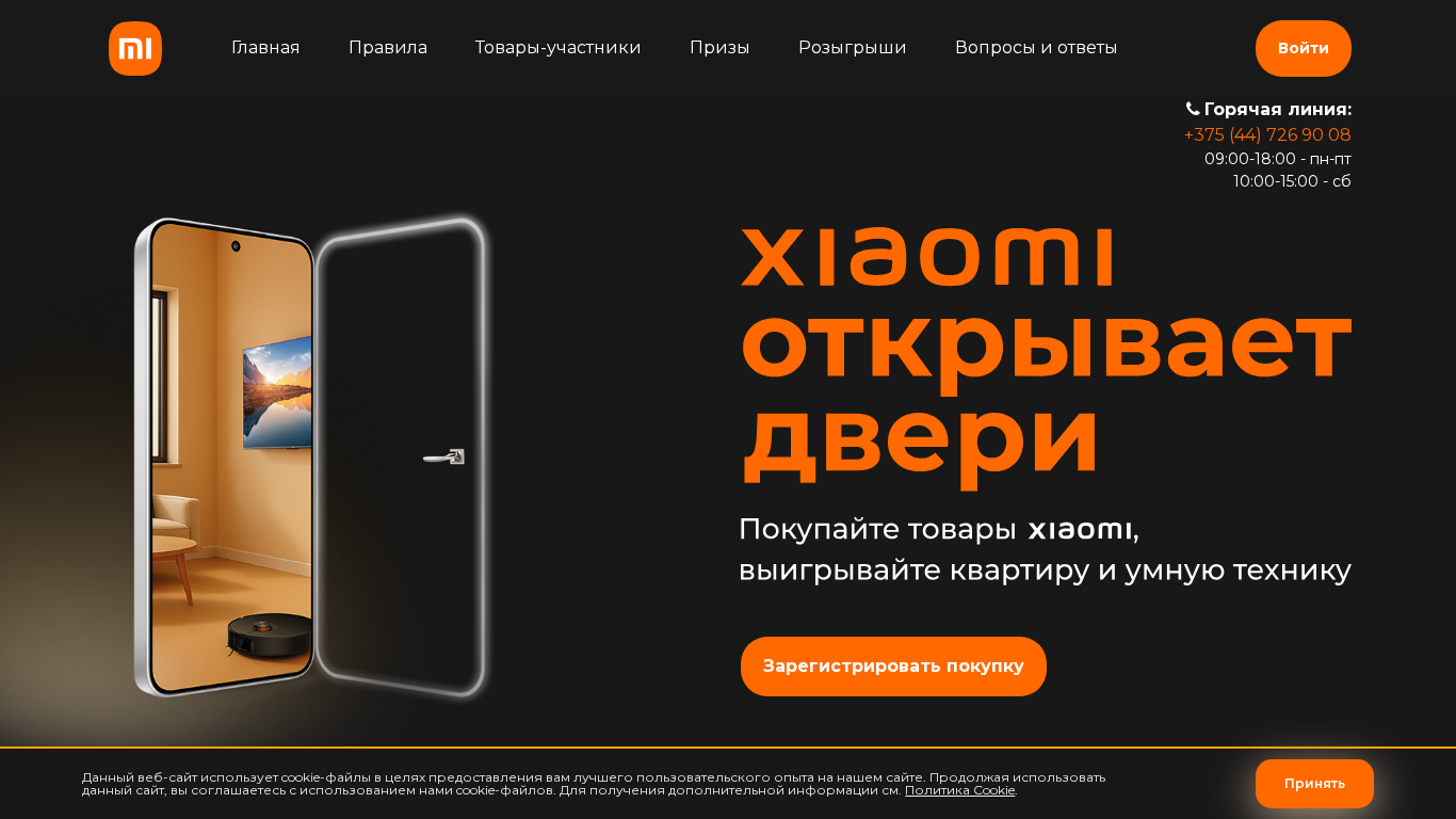 | AI-анализ | The web project "Xiaomi Promotional Game" invites visitors to purchase Xiaomi, Redmi, and POCO products from partnering stores between August 11 and September 21, 2025. Upon registering the warranty cards on the xiaomi.by website, participants receive game codes for each eligible purchase. These codes can be used to enter a raffle for a grand prize of an apartment in Minsk, as well as other valuable prizes, such as televisions, robot vacuums, air fryers, and more. The game's rules, FAQs, and a hotline number for inquiries are provided on the site. A list of participating products includes various smartphones, tablets, vacuums, televisions, kitchen appliances, and wearable devices. Multiple draws for prizes are scheduled throughout the promotion period. |