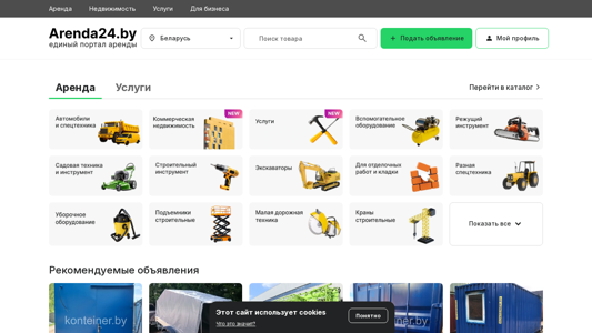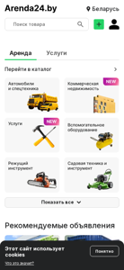 | AI-анализ | The website "Аренда24: строительная техника, оборудование, недвижимость - Беларусь" (Rental24: Construction Equipment, Rentals, and Real Estate - Belarus) is a unified portal where users can easily rent or lease commercial property, construction equipment, and machinery among organizations and individual entrepreneurs across Belarus. The website includes sections for business services, registration, login, and categories such as construction equipment, real estate, and services. Users can view recommended advertisements for items like used work trailers, hydraulic cranes, and shipping containers. The website also offers a catalog for users to browse and a feature to hide or show all listings. The top keywords on the site include 'call', 'other', 'Minsk', 'byn', 'rent', 'services', 'OOO', 'all |