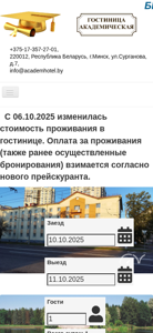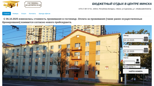 | AI-анализ | This website is for a budget hotel named 'Академическая' located in the center of Minsk, Belarus. The hotel has four floors and is situated near the 'Академия наук' metro station. The description mentions the availability of 44 comfortable rooms with all necessary amenities, a cafe with 24 seats, a coffee vending machine in the lobby, and a secured city parking lot nearby. The hotel operates 24/7 and is under constant surveillance. Guests can check-in after 14:00 and must check-out by 12:00. A reservation is valid until 19:00, and early check-ins or late check-outs are possible for an additional fee. The hotel is close to the National Academy of Sciences of Belarus, Central Botanical Garden, Park of Culture and Leisure, |