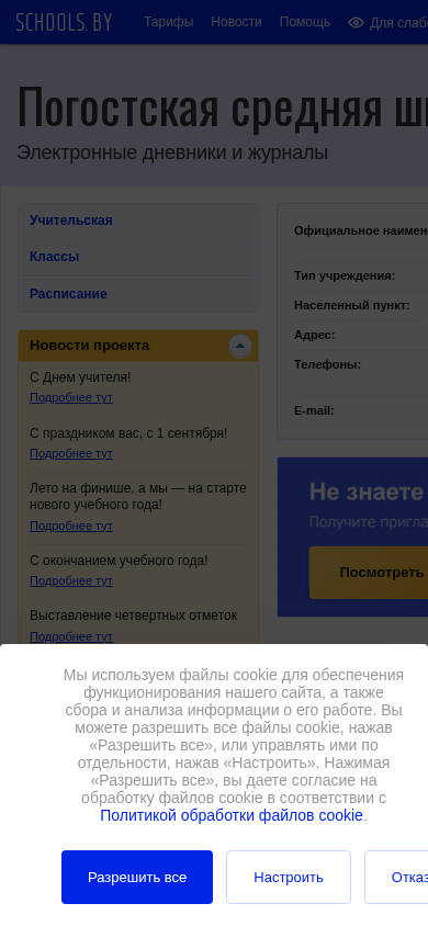 | AI-анализ | --- This online resource belongs to the Pogost Middle School of Soligorsky Region in Belarus. The website's title is "Погостская средняя школа Солигорского района" and it contains information about the school. The description mentions the use of cookies for site functionality and data collection. The keywords include 'cookie', 'сайта', 'файлов', 'подробнее', 'тут', 'октября', 'файлы', '2022', 'код', 'ярмошук', 'нет', 'комментариев', 'можете', 'все', 'пригласительный', 'согласие', 'обработку', 'обработки', 'согласен', '-на'. The color scheme is customizable from A to A+, and images are turned off in black |