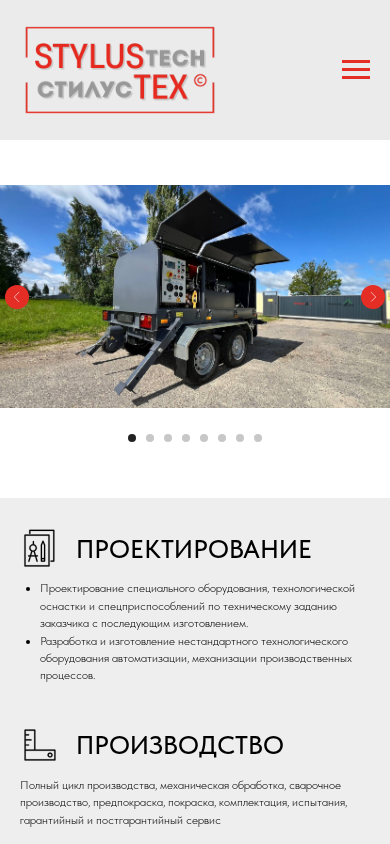 | AI-анализ | The web project StylusTech is a company specializing in the design and manufacture of food and chemical technology equipment since 2012. The website offers information on their products and services, including cranes, transthorne manipulators, tubular lifts, presses, mixers, and industrial lines, elevators, and transport trucks with various capacities. The company also provides services such as certification, production certification, and personnel contacts. The site includes a production section detailing the design and manufacturing process of custom equipment, as well as automated and mechanized production processes. StylusTech also offers a full production cycle, including mechanical processing, welding, pre-painting, painting, assembly, testing, and guarantee and post-guarantee service. The site provides certification for their products and production processes, including declarations and certificates of conformity, certificates of origin, and |