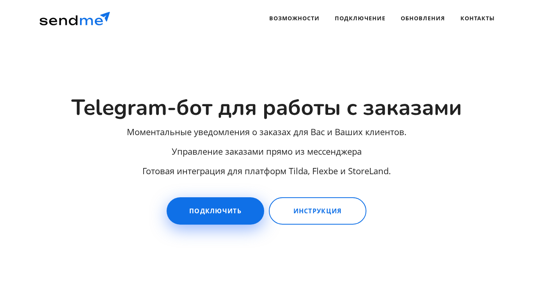 | SEO-описание | Telegram-бот для работы с заказами и рассылки уведомлений для Storeland, Flexbe, Tilda. Бесплатные уведомления о новых заказх. |