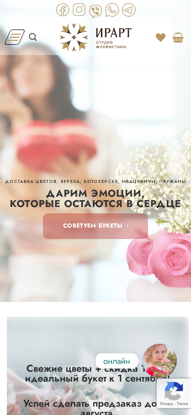 | AI-анализ | --- The website 'Цветы Береза - Доставка Цветов в Березе' is an online florist store based in Bereza, Belarus. It offers a wide range of fresh flowers, bouquets, and flower arrangements for delivery within the city at affordable prices. Customers can purchase flowers online or place a rush order. The store claims to be the best florist in the city. Delivery starts from 70 rubles, and there is an option for free delivery on certain purchases. The website also provides a catalog for upcoming holidays and events, such as '1 сентября' and 'Цветы на 8 марта'. Some flowers are currently on sale with discounts up to 11% off. The store allows customers to save their favorite bouquets for future purchases. The website is available at irart.by. |