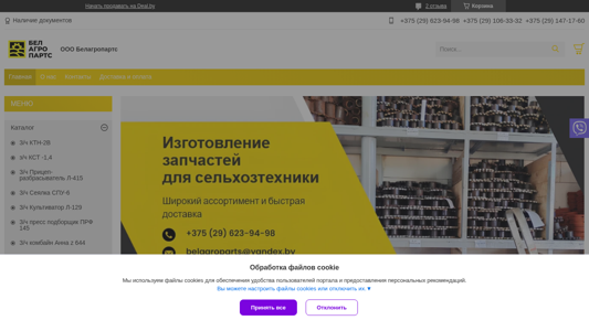 | AI-анализ | The website <ba-parts.by> is an e-commerce platform for the Belarusian company "ООО Белагропартс" that offers contacts, products, and services with prices. The site features a catalog of agricultural machinery and equipment such as cultivators, plows, seeders, presses, and zernosushilnyy (grain dryer) components. Products are available for both retail and wholesale purchase, with various contact numbers provided for inquiries and orders. The company's registration information is listed, and the site is registered under the name "ООО Белагропартс" and the domain <ba-parts.by>. |