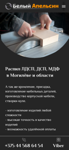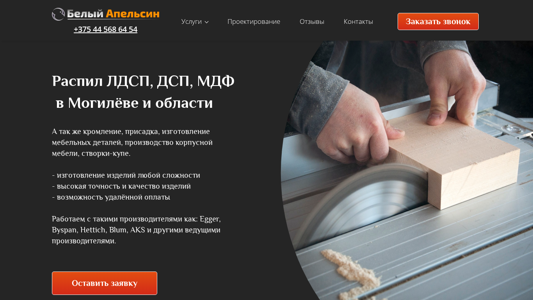 The website "Раскрой ЛДСP в Могилёве" (Custom LDSP Cutting in Mogilev) is a Belarusian business website that offers custom furniture production services. The company, OOO "Белый Апельсин" (Beliy Apelsin), provides various services including custom order furniture, cutting and processing of LDSP and DSP, postforming, veneering, carving, and furniture design. The website includes a contact section with a phone number and an option to leave a request for a call back. The top words suggest that the website offers remote payment and order placement, as well as information about the materials used such as LDSP, DSP, and MDF. The website also mentions partnerships with leading furniture manufacturers like Egger, Byspan, Hettich, Blum, and AKS. The website offers