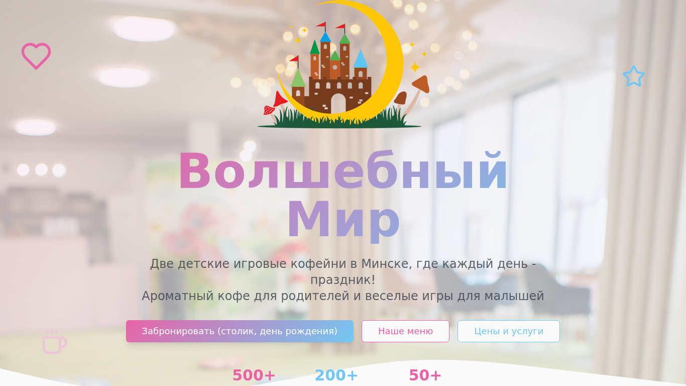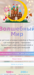The web project "Волшебный Миr - Детская игровая кофейня" (valshebnyi-mir.by) is a children's play cafe located in Minsk, Belarus. The establishment offers aromatic coffee for parents and a safe play area for children. They host birthday parties and family celebrations. Keywords associated with the project include 'coffee', 'rubleys', 'magical world', 'Minsk', 'playground', and 'children's cafe'. The website mentions two locations in the city, each with a large play area, premium coffee, and various services for family events. The cafe's menu, prices, and services are also accessible on the site.