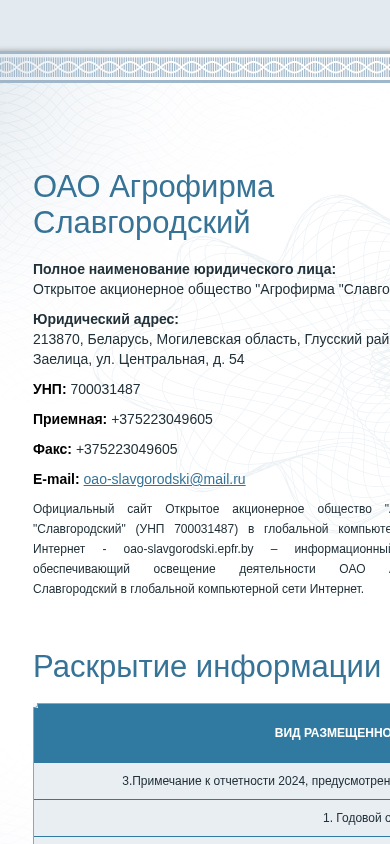 | AI-анализ | This online resource is the informational website of Open Joint Stock Company "Agrofirm Slavgorodsky" (UNP 700031487), located in Belarus, Mogilev Oblast, Glyssky District, Ag. Zaelitsa, Central Street, house 54. The site provides information about the company's activities in the global computer network Internet. It includes downloadable annual reports from 2019 to 2024, as well as a note on reporting requirements for 2024 according to Belarusian legislation. The site also features a login page for accessing a personal cabinet, with options for registration and password recovery. |