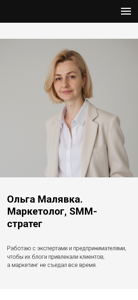 | AI-анализ | The web project "Ольга Малявка СММ Брест" (olgamalavka.by) is a marketing consulting business focusing on social media promotion and advertising. The project owner, Olga Malyavka, offers services to entrepreneurs and professionals to help them attract clients and systematize marketing efforts. The description contains keywords such as "smm," "продвижение и реклама в соцсетях," and "стратегия." The website's top words include phrases like "работать," "помогу," "систематизировать," and "охваты," suggesting a systematic and organized approach. The project also mentions experience with various social media platforms like Instagram, TikTok, and YouTube, and offers services related to content marketing and optimization. The given case study showcases successful results for a client named Беловеж |