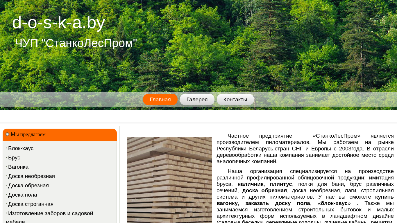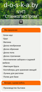 | AI-анализ | The portal d-o-s-k-a.by, operated by Private Enterprise "StankoLesProm," specializes in the production and sale of various profiled decorative building materials, including imitation logs, skirting boards, threshold strips, shelves for saunas, logs of different sections, oblique and non-oblique plywood, lags, and other pine lumber products. The company has been active in the Belarusian, CIS, and European markets since 2003, and has established a strong reputation in the woodworking industry. Clients can purchase a range of items, such as wagon sheds, flooring, and 'block-houses.' Additionally, the company manufactures various garden structures, including gazebos, wooden wells, shower cabins, fences, playground elements, and other small architectural forms for landscape design. All products |