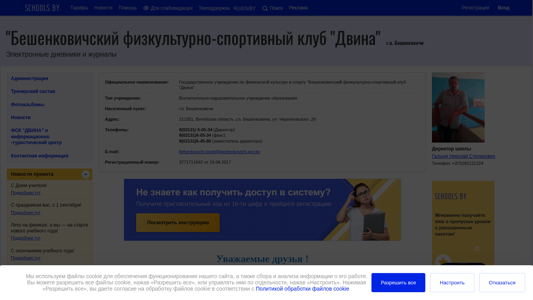 | AI-анализ | The portal "FSK Dvina" is a Belarusian sports club website operated under the domain fskdvina.schools.by. It uses cookies for website functionality and data collection and analysis. Visitors can allow or manage cookie settings through the website. The site contains information about the club, its activities, and offers a registration form. The design is in the A-A+ font range with a negative space interval and a monochromatic color palette. Images are turned off in black and white. |