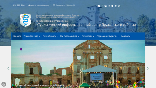 | AI-анализ | The portal is the official website of the Tourist Information Center of Pruzhansky District in Belarus. It provides comprehensive information about the district, including news and events, tourist attractions, places of interest, accommodation options, dining establishments, and various services. The website also includes a schedule of the center's administration hours and a form for submitting inquiries. The site is operated by the Ministry of Sport and Tourism of the Republic of Belarus in collaboration with the Pruzhansky District Executive Committee. The content is available in Russian, Belarusian, and English versions for visually impaired users. The website includes sections on the district's history, cultural institutions, sports facilities, and contact information for various services, such as banks, taxis, post offices, pharmacies, and gas stations. Additionally, the site offers a calendar of events, a directory of tourist-related services, |
